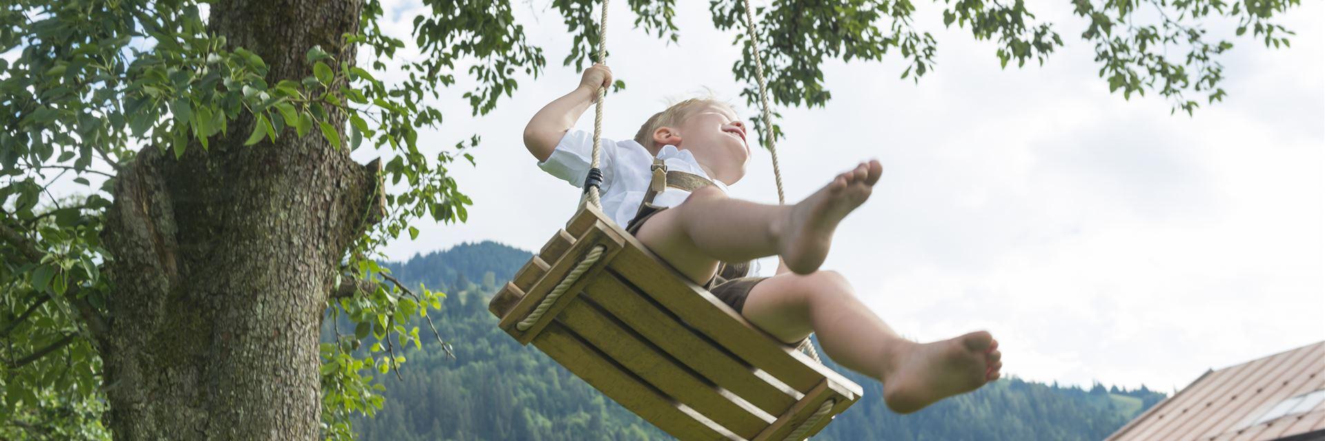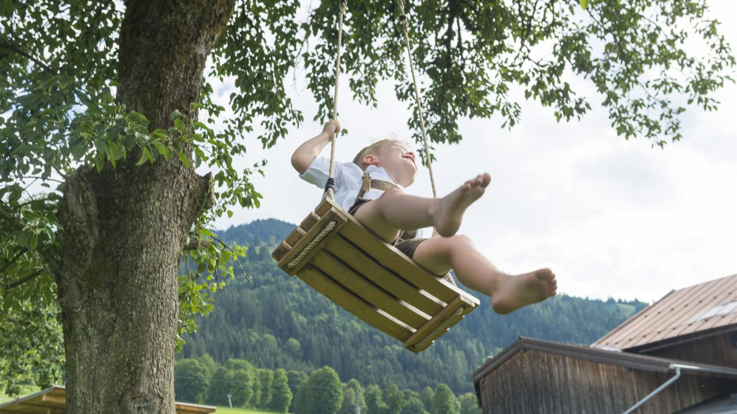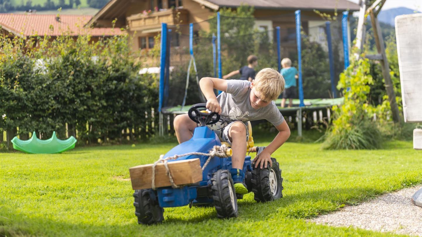Im nahegelegenen Obstangerl findet ihr weitere Highlights wie eine Baumschaukel, Trettraktoren und Anhänger – hier ist für jeden etwas dabei.