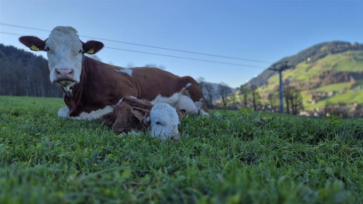 Wir haben 12 Kühe, die uns mit der notwendigen Milch versorgen, sowie etwa 10 Jungtiere im Stall. Seit 2016 dürfen sich unsere Rinder in einem modernen Laufstall den ganzen Tag frei bewegen und sind von Frühling bis Herbst täglich auf der Weide.